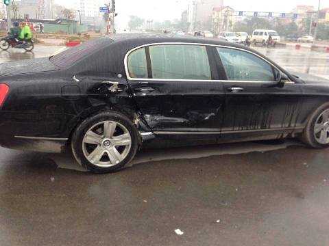 Cú va chạm khiến xe Bentley bị quay ngược 1 vòng rồi văng ra lề đường. Theo quan sát của PV, phần hông chiếc siêu xe này bị đâm móp sau cú đâm mạnh của chiếc ô tô 7 chỗ.