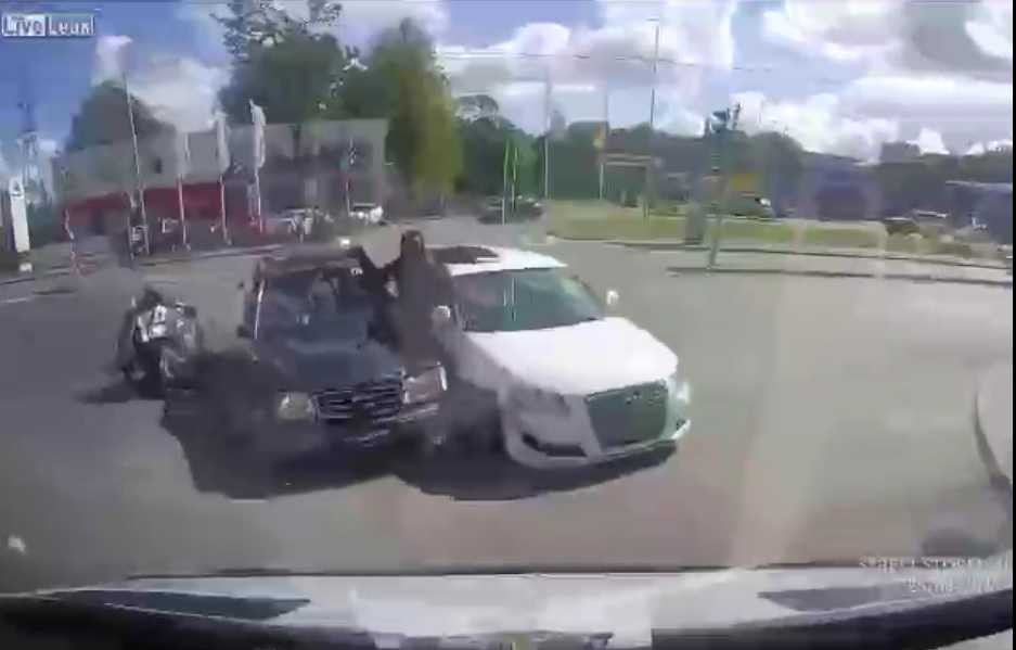 (VTC News) - Anh chàng lái môtô cố tình vượt đèn đỏ đã đâm vào chiếc ôtô đang đi, nhưng may mắn lăn lên kẹp giữa hai nóc ôtô và thoát chết trong gang tấc.