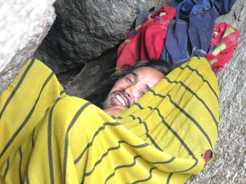 Tưởng như lời cảnh báo của Oi Phơr là sự thực khi chúng tôi tìm mãi vẫn không thấy một bóng người nào…thì bất ngờ chúng tôi bắt gặp những chiếc tô, chai nhựa được vứt lăn lóc dưới một ngọn núi đá. Một con đường mòn cắt qua những bụi le dẫn lên núi chứng tỏ hằn những dấu chân người đi. Chúng tôi im lặng nối gót nhau và giữa khe núi hẹp thành một hang núi nhỏ một mái tóc dài rối xù hiện ra giữa đống chăn, áo quần cũ nhàu.