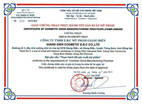 Ngày 18/11/2015 công ty mỹ phẩm White Doctors – EBC đã được Bộ Y Tế cấp giấy chứng nhận chất lượng sản xuất theo tiêu chuẩn Châu Á CGMP – ASEAN và được xuất khẩu chính thức đi tất cả các nước trên toàn thế giới.