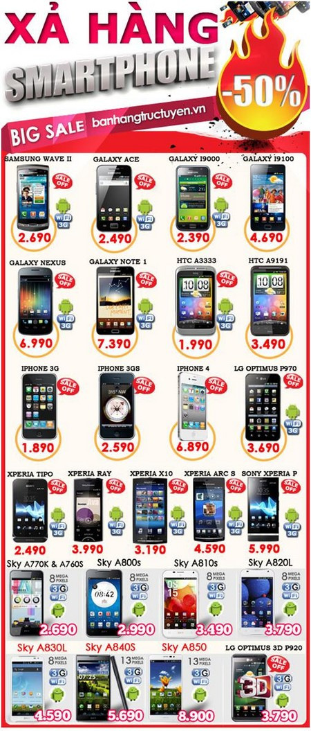 (VTC News) - Chương trình xả hàng tồn kho Smartphone với ưu đãi giảm giá lên tới 50%, áp dụng trong tháng 4 từ ngày 5/4 cho tới hết ngày 1/5/2013