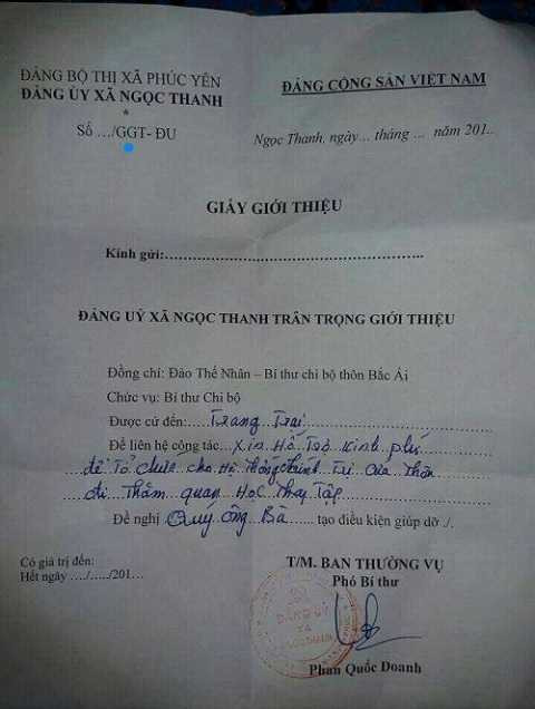 Tin tức trước đó, Đảng ủy xã Ngọc Thanh, Thị xã Phúc Yên đã cấp giấy giới thiệu cho ông Đào Thế Nhân (Bí thư Chi bộ thôn Bắc Ái) được cử đến trang trại để “xin hỗ trợ kinh phí để tổ chức cho hệ thống chính trị của thôn đi thăm quan học tập”.