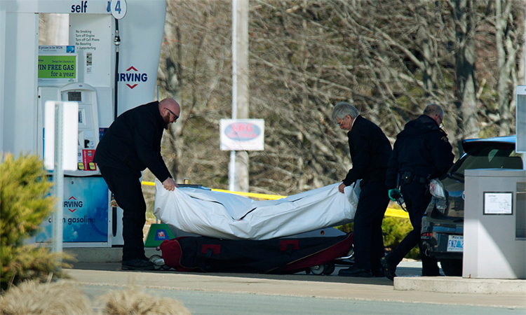 Nhân viên pháp y đưa thi thể một nạn nhân khỏi cây xăng ở Enfield, Nova Scotia, Canada, ngày 19/4. Ảnh: AP.