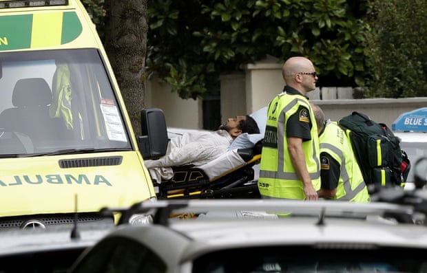 Các nhân viên cứu thương hỗ trợ một nạn nhân sau vụ xả súng ở hai nhà thờ tại New Zealand. Ảnh: AP.