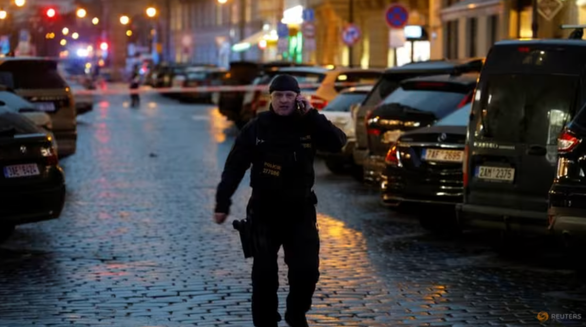 Một sĩ quan cảnh sát bảo vệ khu vực sau vụ xả súng tòa nhà của Đại học Charles ở Praha. (Ảnh: Reuters)