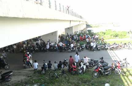 Rất đông người dân tập trung dưới chân cầu Tuyên Sơn để chứng kiến sự việc