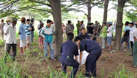 Nhân chứng cho biết, nạn nhân chết trong tư thế treo cổ trên cây bằng dây thừng, cách mặt đất khoảng 1m. Điều đáng nói là hai tay nạn nhân bị trói chặt bằng dây dù màu xanh.