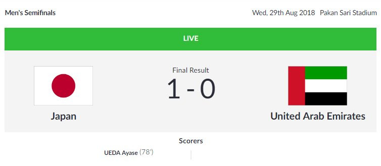 Ở trận bán kết thứ hai vừa kết thúc cách đây ít phút giữa Olympic Nhật Bản và Olympic UAE, đội bóng xứ mặt trời mọc đã có chiến thắng tối thiểu để giành quyền vào chơi trận chung kết với Olympic Hàn Quốc. Bàn thắng duy nhất của trận đấu được ghi bởi Ueda Ayase ở phút 78.