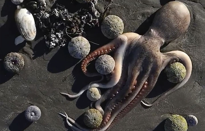 Các hình ảnh được chia sẻ trên mạng xã hội Nga cuối tuần qua cho thấy xác bạch tuộc, nhím biển, cua và các sinh vật biển khác nằm la liệt trên các bãi biển vùng Viễn Đông Nga.