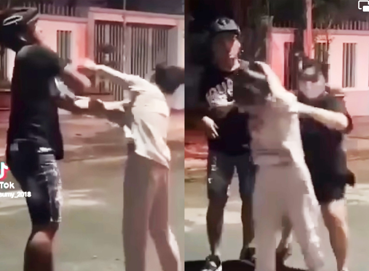 Cô gái cúi mặt và “xin lỗi”, thì người đàn bà đi cùng cầm nón bảo hiểm lao vào đánh vào đầu cô gái và nói “mày xin lỗi kiểu đó hả”.