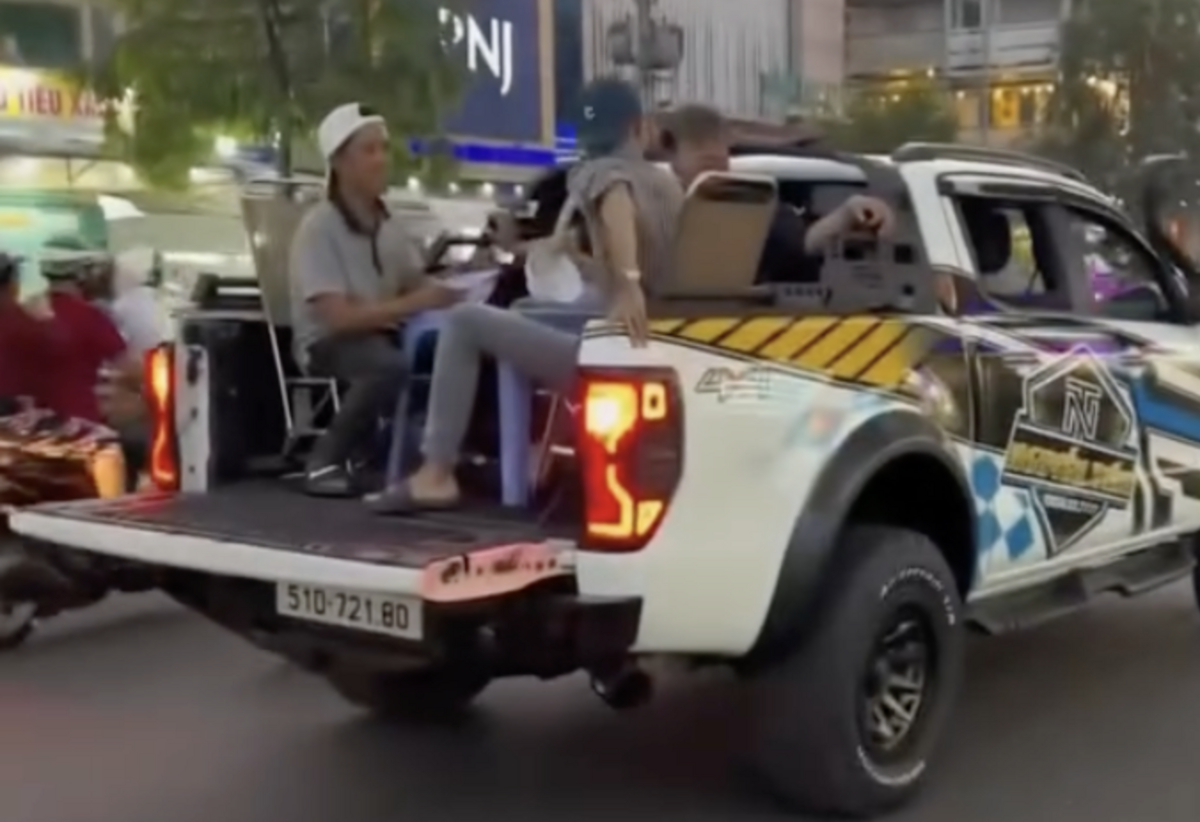 Trước đó, mạng xã hội chia sẻ clip ghi lại cảnh nhóm người ngồi trên thùng xe bán tải, dừng trước một tiệm hủ tiếu trên đường Hậu Giang, phường Bình Tây để mua đồ ăn. Sau đó, cả nhóm mang bát, đũa quay lại xe, đặt bàn ghế trên thùng xe rồi ngồi ăn uống trong lúc phương tiện tiếp tục di chuyển.