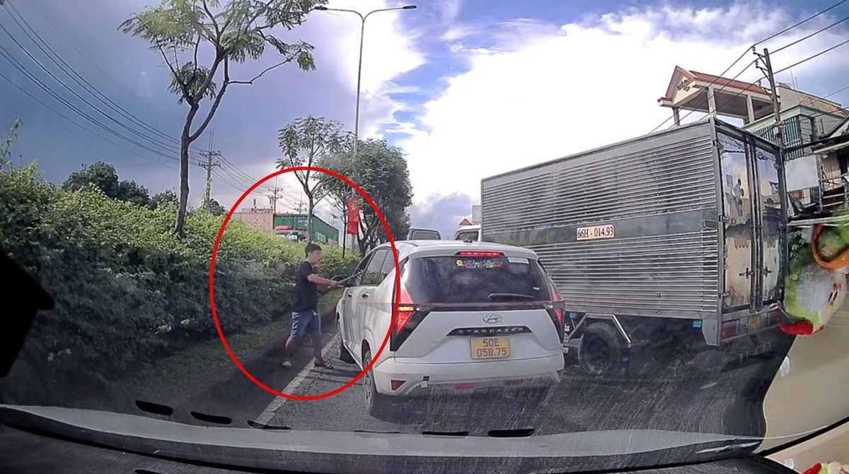 Theo hình ảnh từ camera hành trình, trong lúc lưu thông, tài xế xe tải bất ngờ lạng lách rồi vượt lên chặn đầu chiếc ô tô đi cùng chiều. Sau đó, người này cầm theo một vật nghi là hung khí, tiến đến đập vỡ cửa kính bên hông xe.
