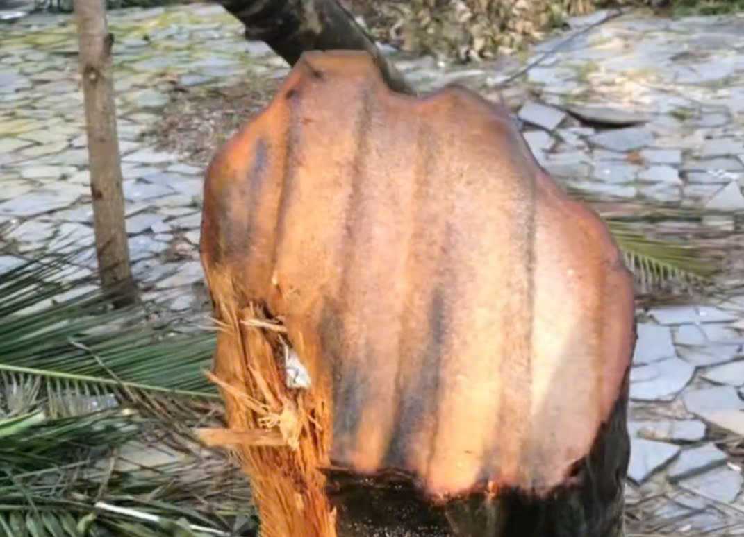 Trong video dài 27 giây được tài khoản “ĐCCN” đăng tải, một gốc dừa bị cắt ngang, phần vết cắt có gợn sóng giống hình dáng tấm tôn. Người quay cho rằng trong lúc bão số 13 quét qua, tấm tôn bay đã “chém đứt” thân dừa, điều hiếm thấy từ trước đến nay.