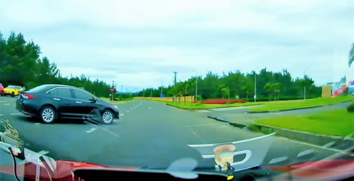 Tuy nhiên, xe biển số xanh rẽ phải bất ngờ vào sân bay Tuy Hòa khiến xe của anh C.Q.L có gắn camera đi đúng làn đường đang chạy với tốc độ cao phải thắng gấp, rất may anh L. xử lý kịp thời nên không xảy ra tai nạn nghiêm trọng.