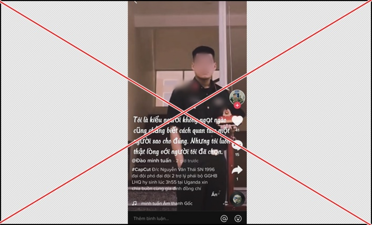 Cụ thể, một tài khoản trên mạng xã hội Tik Tok là Đào Minh T., với hình ảnh mặc quân phục Quân đội Nhân dân Việt Nam đã đăng tải thông tin: "Đ/c Nguyễn Văn Thái - Đại đội phó Đại đội 2, trợ lý phái bộ Hòa bình Liên Hợp Quốc hy sinh lúc 3h55' tại Uganda. Xin chia buồn cùng gia đình đồng chí".