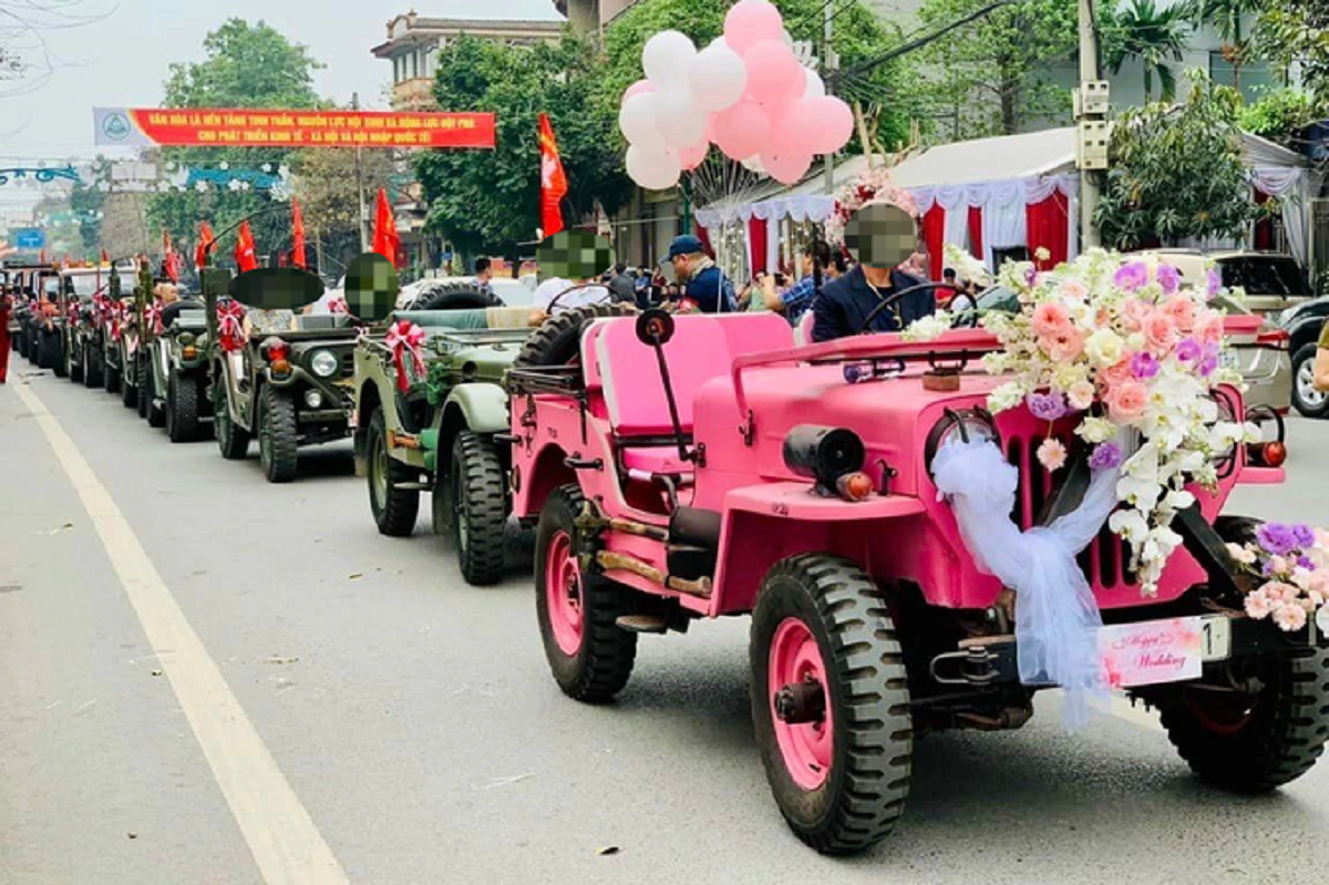 Trước đó, ngày 11 và 12/3, hơn 20 chiếc xe Jeep các loại tham gia đoàn rước dâu tại TP Thái Nguyên, tỉnh Thái Nguyên. Đoàn xe chạy qua nhiều tuyến phố và dừng lại điểm cuối là nơi tổ chức buổi lễ.