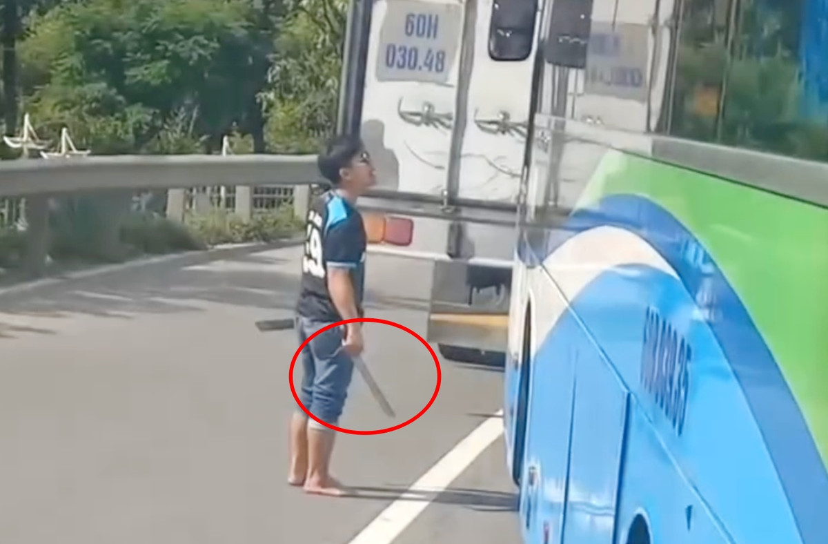 Cụ thể, trưa 16/10, trên mạng xã hội chia sẻ clip ghi cảnh người đàn ông cầm dao "nói chuyện" với tài xế xe khách tại quốc lộ 1 (đoạn trên cầu vượt Trạm 2, phường Tân Phú, TP Thủ Đức).