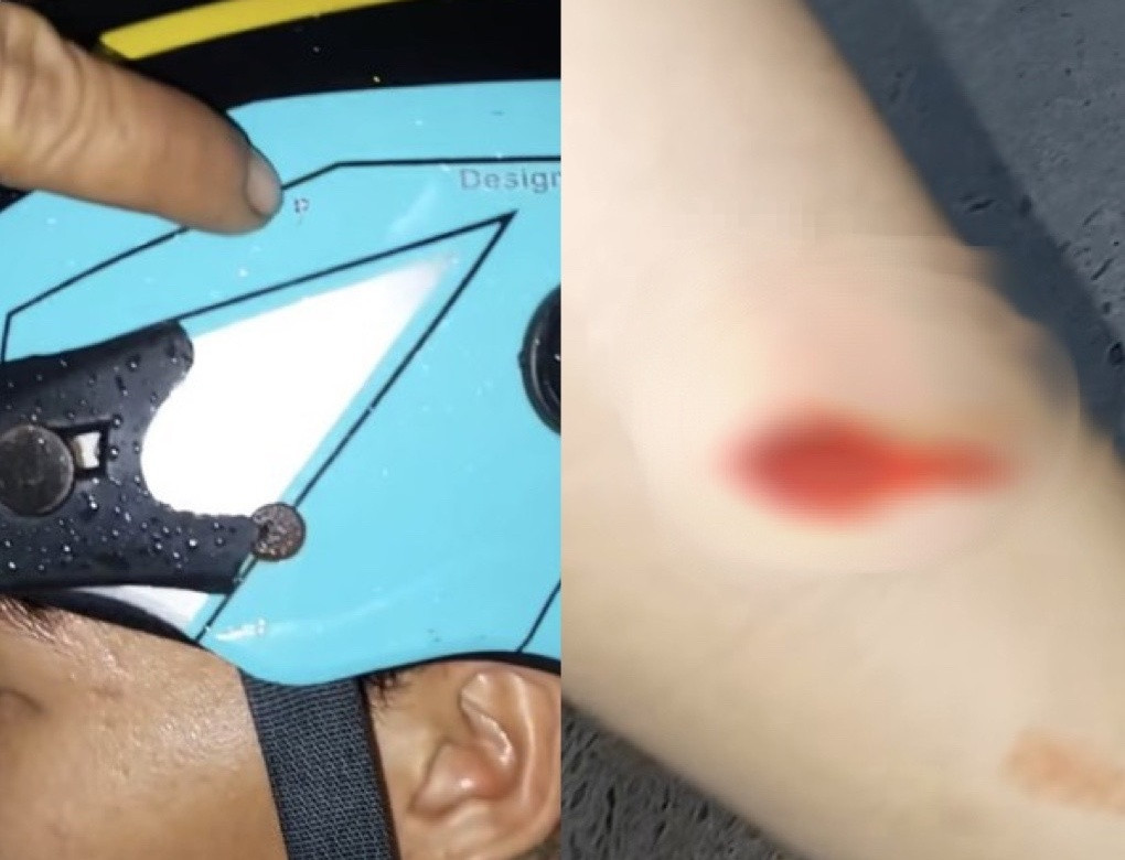 Lúc này, 2 người lạ vượt lên chặn đầu xe, dùng vật giống súng hơi bắn một phát trúng vào nón bảo hiểm của người chồng và một phát trúng vào bắp chân trái người vợ.