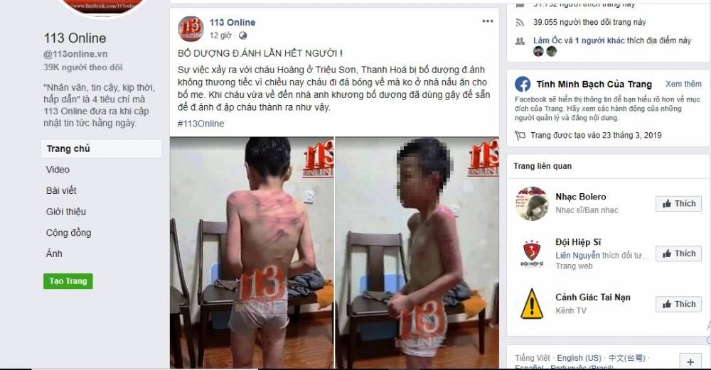 Thông tin cháu bé ở Thanh Hóa bị cha dượng hành hung đăng tải trên facebook. (Ảnh chụp màn hình)