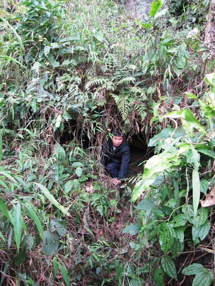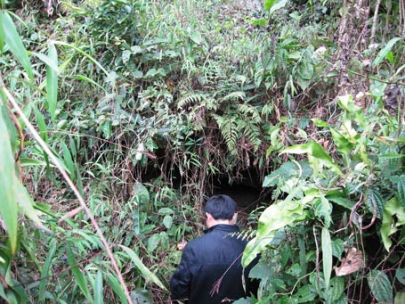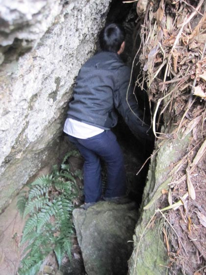 Nhặt mấy viên đá nhỏ ném vào, rồi bẻ một cành cây huơ huơ phía trước dò đường, chúng tôi thận trọng chui vào cái ngách tối om lạnh lẽo ấy. Chỉ có thể ngồi mà di chuyển chầm chậm. Mười bước, hai mươi bước, bỗng thấy phía trước có ánh sáng, mở ra một lối đi.