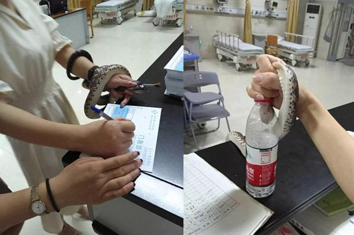 Mạng xã hội từng được dịp xanh mặt với màn vào viện cấp cứu của một cô gái trẻ. Cụ thể, một cô gái độ khoảng 20 tuổi bước vào phòng cấp cứu của Bệnh viện Nhân dân huyện Phổ Giang, Trung Quốc với một con rắn sống trên tay trái.