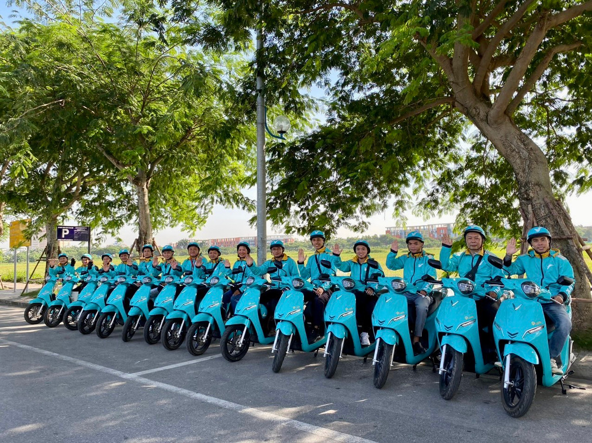 Hình ảnh dàn tài xế cùng xe điện VinFast hoạt động dịch vụ xe ôm công nghệ Xanh SM được lan truyền.