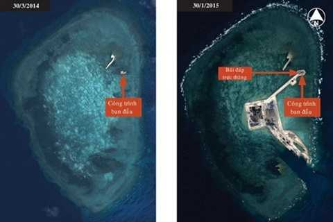 Kết luận ấy dựa trên việc phân tích các ảnh chụp từ vệ tinh. Ví như ởbãi đá Hugues, ảnh vệ tinh cho thấy: vào 1/2/2014 còn là một khung bêtông có diện tích 380m2. Tới 14/8/2014, khung bê tông này được lấp đầycát. Và tới 24/1/2015 xuất hiện một hòn đảo thực sự rộng 75.000 m2 vàcác ngôi nhà kiên cố. Tới mùa xuân hoặc hè năm 2015, công trình này cóthể hoàn thành và thực hiện các chức năng quân sự. Cấu trúc của các hònđảo nhân tạo này giống nhau: hình vuông, với một ra đa và tháp phòngkhông ở mỗi góc.