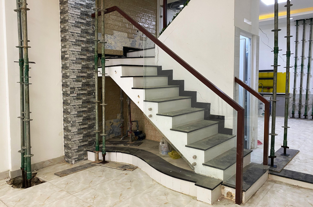Hệ thống kính cường lực ở khu vực cầu thang (số nhà 2/36A Cao Thắng) vỡ vụn do chịu ảnh hưởng trực tiếp từ công trình xây dựng số 430 - 430A.