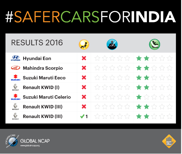 Cả 5 mẫu xe hơi Hyundai Eon, Renault Kwid, Maruti Suzuki Celerio, Maruti Suzuki Eeco và Mahindra Scorpi đều bị đánh giá 0 sao trong thang điểm 5 sao về độ an toàn dành cho tài xế. Điều này đã cho thấy, mức độ an toàn của các mẫu xe giá rẻ còn hạn chế.