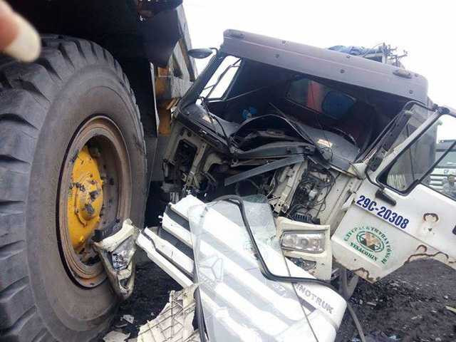 | Đầu xe ben nát bét sau khi va chạm với siêu xe tải Komatsu |