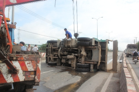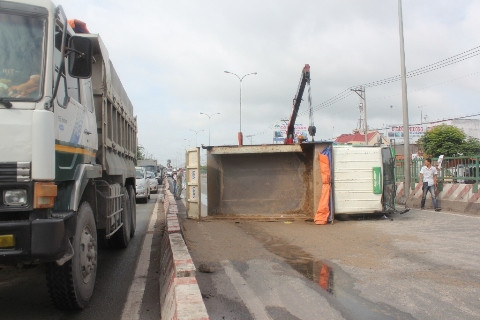 Vụ tai nai nạn xảy ra vào lúc 2 giờ 30' sáng 21/7, trên quốc lộ 1A, đoạn cách giao lộ Ao Đôi khoảng 50 mét (P.Bình Trị Đông A, quận Bình Tân, TP.HCM).Hiện trường vụ xe ben lật