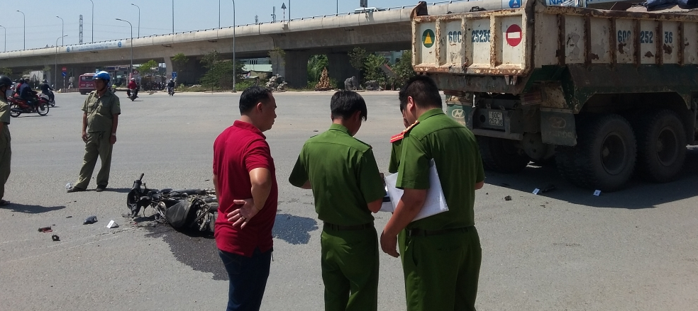 Cú va chạm khiến người này ngã xuống đường rồi bị xe ben cán chết tại chỗ.