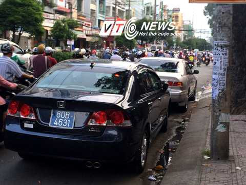 | Hai ô tô biển số xanh đậu đỗ sai quy định trên đường Hùng Vương, Q.10. Ảnh: Tử Long |