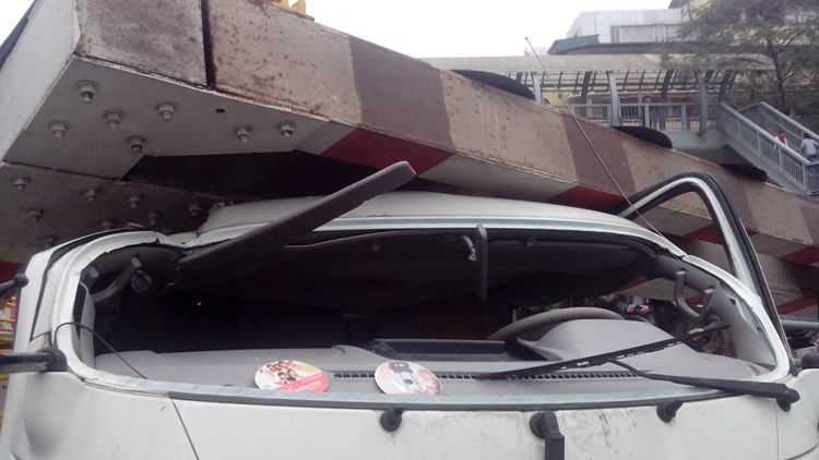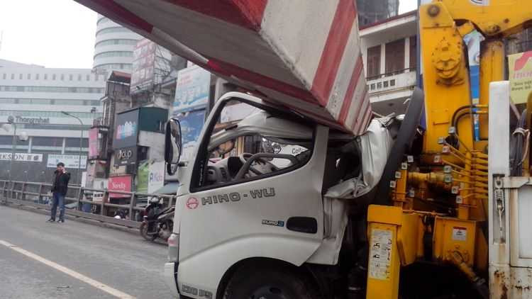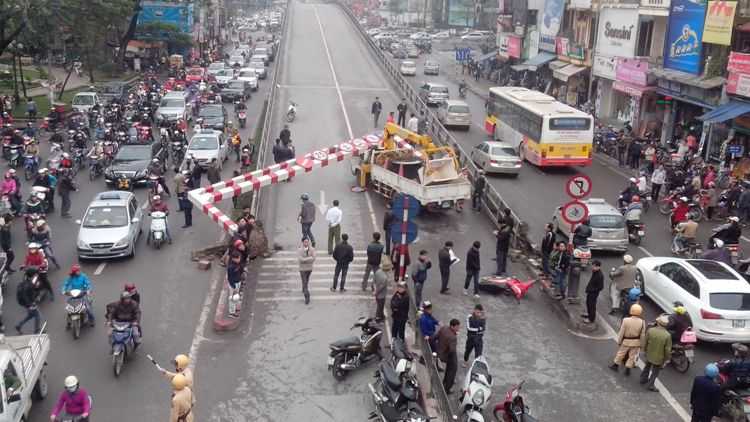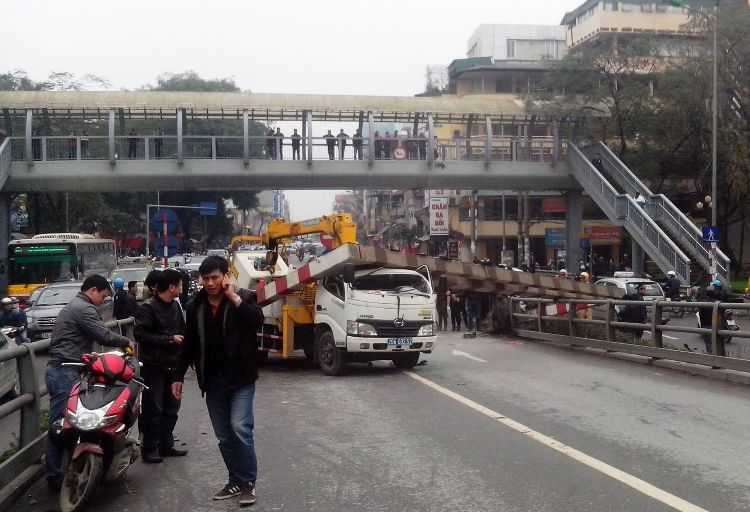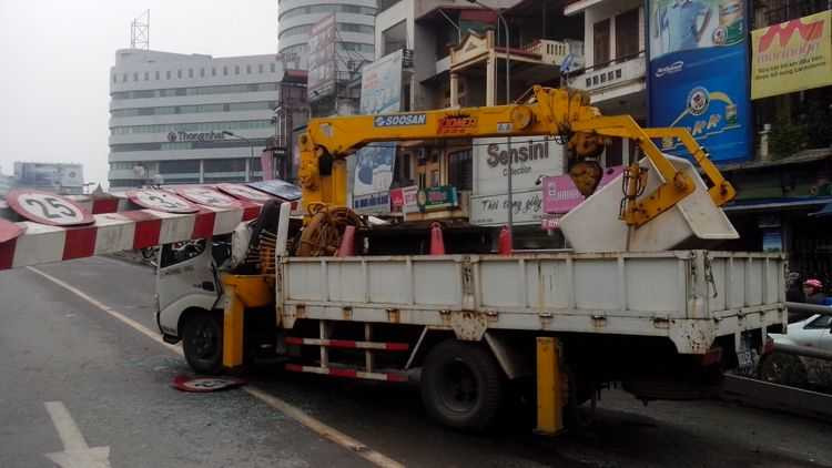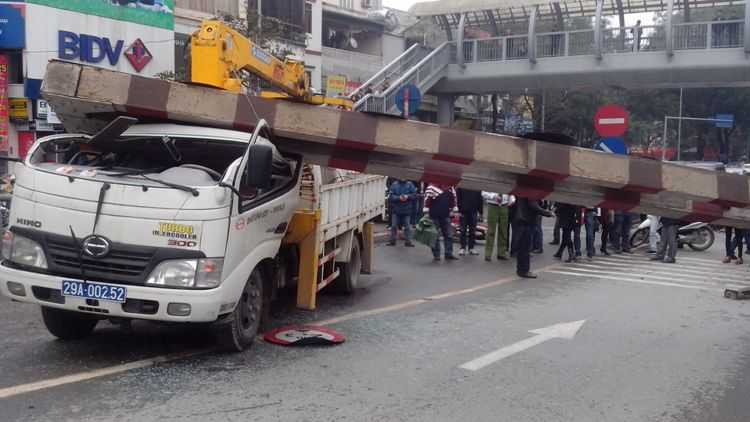 Thời điểm trên, chiếc xe cẩu BKS29M – 002.52 lưu thông chiều Tây Sơn – Nguyễn Trãi cố tình đi lên cầu vượt (chiều cao, tải trọng loại xe này không được phép) đã húc bay thanh chắn ngang khiến toàn bộ đổ sụp xuống đè nát ca bin xe và hất văng một xe máy BKS 89H4 – 3107 do một phụ nữ điều khiển cùng chiều.