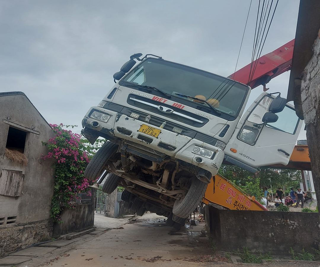 Tại hiện trường, xe bơm bê tông thuộc Công ty TNHH Thương mại và dịch vụ vận tải Viết Hải đậu ở ngoài đường, cabin bị ngẩng lên cao. Vòi bơm bê tông dài hơn 30 m bị nghiêng do một trụ chịu lực bị lún xuống đất.