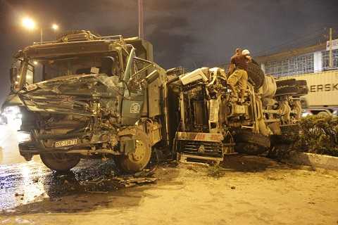 Tại hiện trường, 2 chiếc xe nằm dính liền nhau, phần đầu của 2 xe bị hư hỏng nặng, dầu nhớt, bê tông chảy lênh láng trên đường.