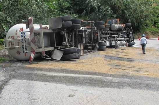 | Đến khúc cua trên đèo do chiếc xe chở gas tránh xe máy chạy ngược chiều nên bị lật nghiêng trên đèo Hải Vân. (Ảnh Lao Động). |
