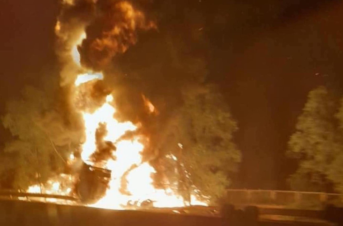 Ngọn lửa liên tục bùng phát dữ dội kèm theo tiếng nổ lớn, sau đó lan sang hàng cây xanh bên phải đường cao tốc.