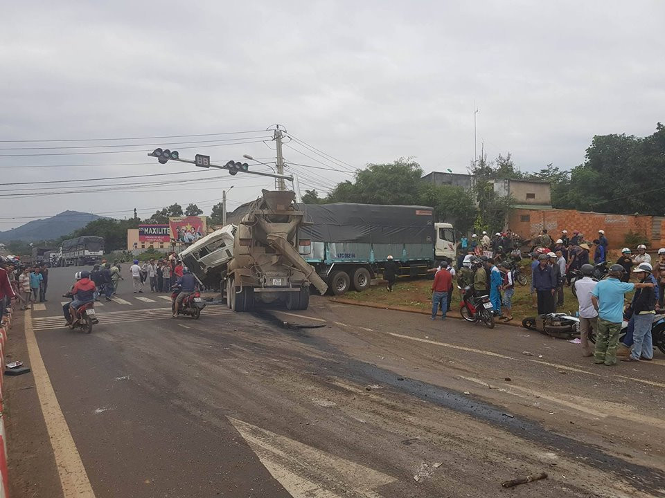 Lúc này, xe bồn chở bê tông mang BKS: 47P-2397 do tài xế Nguyễn Ngọc Dũng (SN 1984, trú TP Buôn Ma Thuột) của Công ty TNHH Xây dựng Phú Xuân chạy đến thì bị mất phanh tông vào đuôi xe tải.