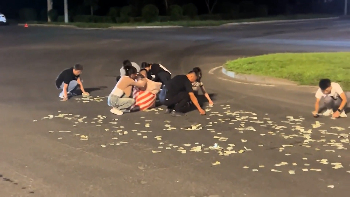 Chiếc xe tải bị hỏng và bao tiền rơi ra đường, những người dân địa phương tốt bụng chạy đến giúp tài xế thu thập những tờ tiền.