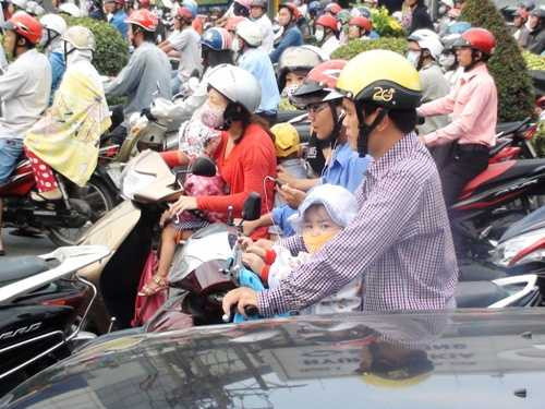 | Giao thông kẹt cứng, xe máy phải len lỏi giữa dòng ô tô để di chuyển rất khó khăn |