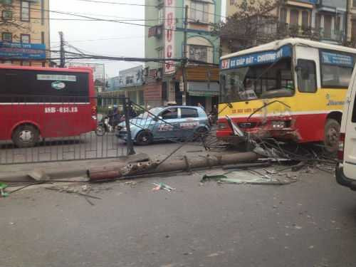 Vụ tai nạn khiến chiếc xe buýt bị biến dạng phần đầu xe, toàn bộ kính trước vỡ vụn, các cột chống trong xe bị cong vênh. Rất may là không có thương vong về người.
