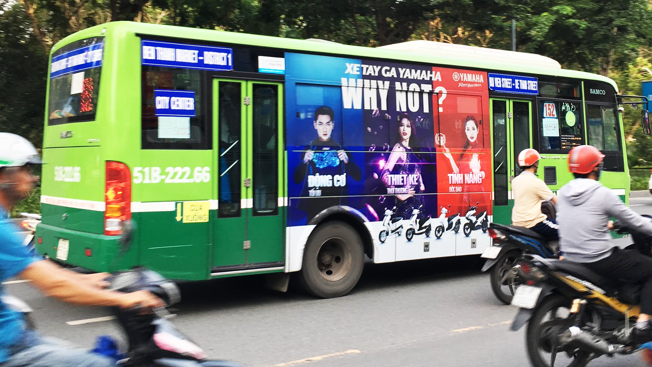 Cụ thể, hình ảnh quảng cáo được in 2 bên thân xe buýt, mỗi bên chiếm đến 50% diện tích thân xe. Để thu hút người nhìn, doanh nghiệp đã không ngần ngại in hình ảnh 3 nghệ sỹ hiện nổi tiếng tại Việt Nam đứng tạo dáng dưới logo tên thương hiệu, phía dưới cùng của tấm quảng in 4 chiếc xe gắn máy của hãng Yamaha cùng dòng chữ "Yammaha tại sao không?"