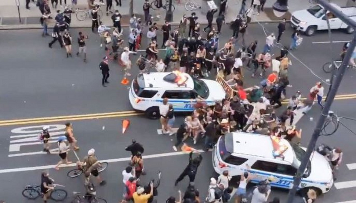Đoạn video dài 27 giây đăng lên Twitter cho thấy một chiếc xe có chữ NYPD (cảnh sát New York) dừng trước đám đông do bị rào chắn. Nhiều người biểu tình ném đồ vật vào xe. Chiếc xe sau đó lao vào hàng rào chắn, xuyên qua đám đông biểu tình. Chưa rõ có thương tích hay không.
