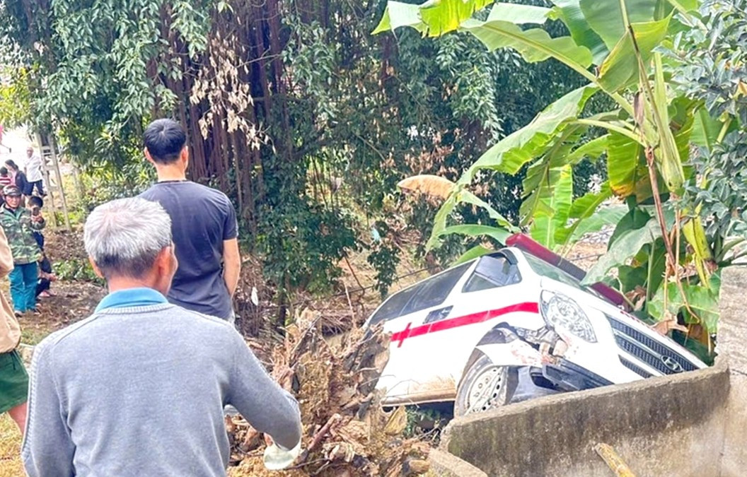 Xe cấp cứu chở thi thể nữ sinh bị mất lái, rơi xuống vực cạn bên đường.