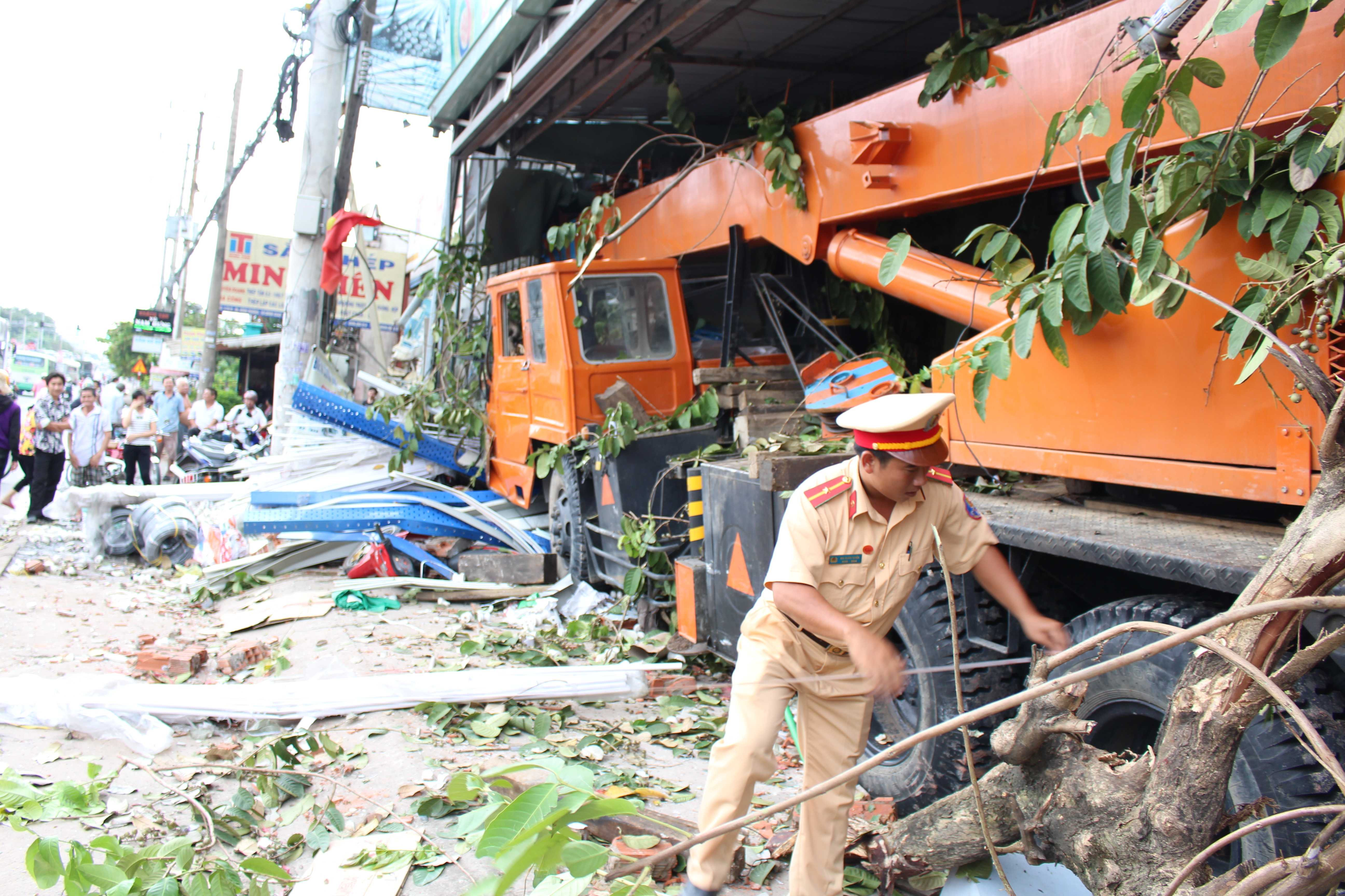 Tại hiện trường, có tất cả 5 xe máy bị tông và cuốn vào gầm xe cẩu. Nhiều xe nát bét, nằm gọn trong gầm xe cẩu, hư hỏng nặng. Xe cẩu đâm đổ cây xanh, cắm đầu vào cửa hàng bán đồ điện gia dụng.