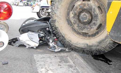 | Bánh chiếc xe cần cẩu nghiền nát xe máy. |