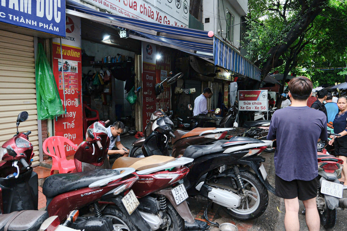 Tại một cửa hàng nhỏ nằm ở ngã ba phố Doãn Kế Thiện, Hà Nội, từ lúc trời vừa hửng sáng, hàng chục chiếc xe đã dựng san sát chờ sửa.