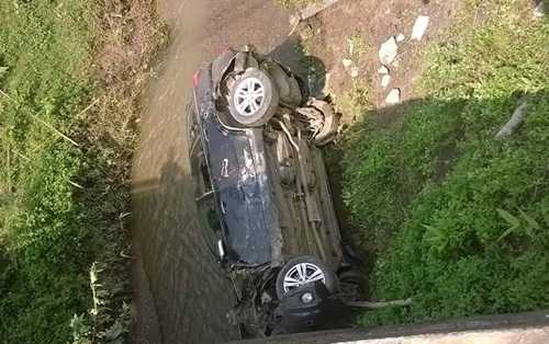 Tại hiện trường, chiếc xe 7 chỗ màu đen bị lật nghiêng khi rơi xuống suối, hư hỏng nhiều bộ phận.