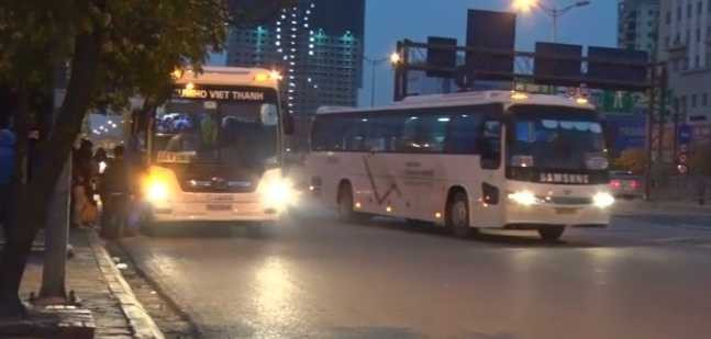 Xe chở công nhân Samsung ngang nhiên dừng đỗ, đón trả trái phép tại khu vực đường Phạm Hùng, Duy Tân (Hà Nội).